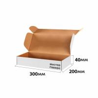 Картонная коробка самосборная с ушками размером 300x200x40 мм в белом цвете – это идеальное решение для упаковки продукции. Прочная структура из гофрокартона обеспечивает надежную защиту содержимого, что делает её отличным выбором для хранения и транспортировки товаров. Данный короб подходит для различных задач: от упаковки продуктов до переездов.